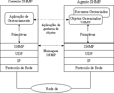 O gerenciamento de uma rede TCP/IP se baseia no protocolo SNMP - Simple Network Management Protocol. O SNMP é um protocolo da camada de aplicação que atua sobre o UDP - User Datagram Protocol. A figura 3.10 mostra a configuração típica da implementação do protocolo SNMP. O protocolo UDP é um protocolo não orientado à conexão, e a sua utilização (ao invés do TCP) se explica pelo fato de que não deve haver interrupções na comunicação de mensagens SNMP. No caso do TCP, uma interrupção em uma conexão, ou rota, influiria no desempenho do sistema de gerência. Ao se utilizar um serviço de datagrama, apesar de se obter um serviço de menor qualidade, esta limitação é contornada, pois em caso de impossibilidade de utilização de uma rota, outra rota é automaticamente escolhida.