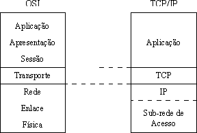 Analisando-se comparativamente a estrutura dos dois modelos (figura 3.10), pode-se observar que a parte referente às sub-redes de acesso da arquitetura internet corresponde à camada física, à de enlace e, parcialmente, à de rede do modelo OSI, sem que haja nenhuma padronização neste sentido.