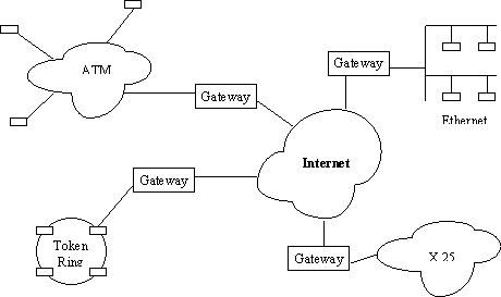 Para que todas estas tecnologias possam ser "vistas" pela rede internet, existe a necessidade de uma conversão de endereçamentos do formato utilizado pela sub-rede e o formato IP. Esta conversão é realizada pelos gateways, que tornam a interconexão das redes transparente para o usuário (figura 3.2). Além das conversões de protocolos, os gateways são responsáveis pela função de roteamento das informações entre as sub-redes.