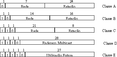Os endereços IP indicam o número da rede e o número do host, sendo que a classe A suporta até 128 redes com 16 milhões de hosts cada uma, a classe B 16384 redes com até 64 mil hosts cada uma, a classe C 2 milhões de redes com até 256 hosts cada uma e a classe D, onde um datagrama é dirigido a um grupo de hosts. Os endereços a partir de 1111 estão reservados para uso futuro.