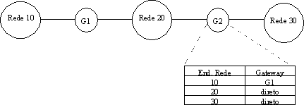 Para realizar o roteamento indireto, os gateways utilizam tabelas de roteamento, que armazenam informações sobre como atingir cada sub-rede da rede internet. Uma tabela de roteamento possui, tipicamente, entradas do tipo (N,G), onde N é um endereço IP (de destino) e G é o endereço IP do próximo gateway a ser utilizado para se atingir N (figura 3.5):