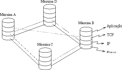 No caso da figura acima, a máquina A quer se comunicar com a máquina B através de uma rede em anel utilizando TCP/IP. A única conexão física que existe entre A e B é através do anel, passando pelas máquinas C e D. A nível de IP, a comunicação não é orientada à conexão, portanto é muito simples enxergar que os dados possuem apenas dois caminhos para ir de A até B: através de C ou através de D. A nível de TCP, porém, a comunicação entre os computadores A e B ocorre como se houvesse uma conexão direta entre eles. Isso implica que, se a nível de IP os dados podem chegar fora de ordem, o TCP tem que garantir a ordenação destes dados, de forma que eles sempre chegem na ordem correta, como aconteceria se houvesse uma conexão física direta entre A e B.