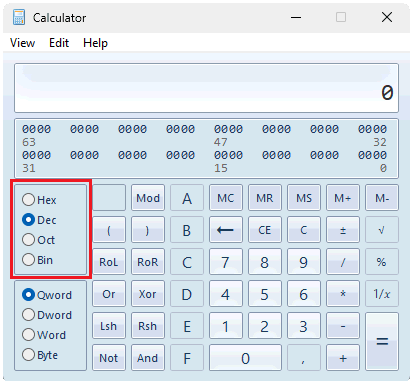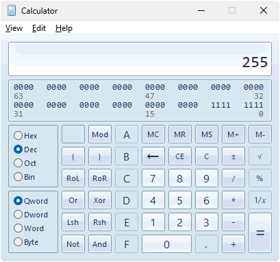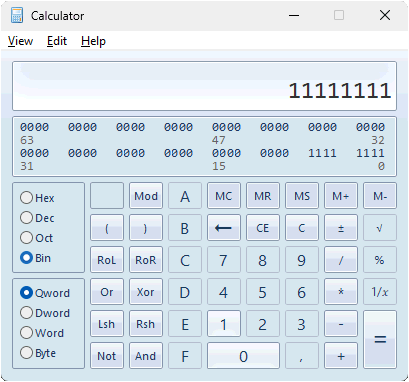 Configure a calculadora para binário e digite o número 11111111, mude a opção da calculadora para decimal (dec) e a calculadora mostrará o número 255, que é o seu correspondente em decimal. Tente de novo agora com o binário 00000000 e terá o número decimal 0.